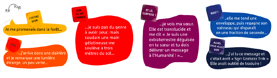 Jeu de dés servant à inventer une histoire à partir de petites illustrations. Stimule l’imagination et la formulation de phrases et d’histoires.